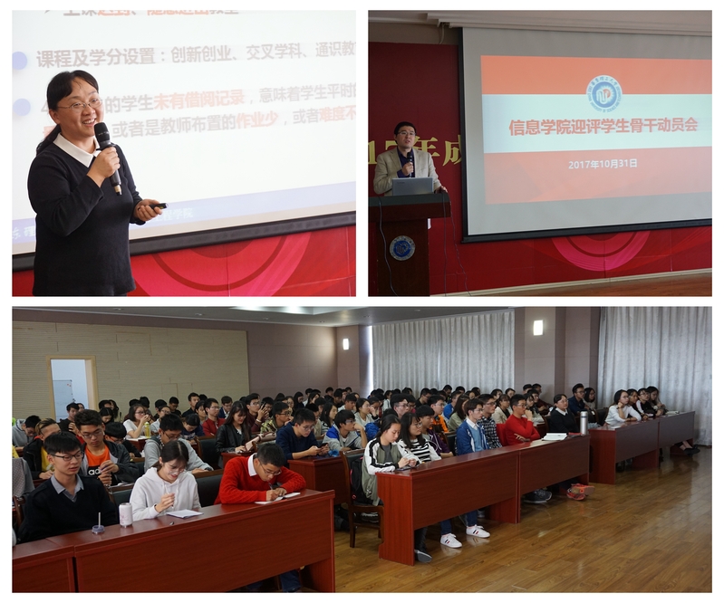 1031日中午,信息学院在奉贤校区大学生活动中心419召开了学院本科教学迎评学生骨干动员及培训会议,会议由学院副书记刘志鹏主持,副院长万永菁作迎评动员及培训,信息学院本科各班学生骨干、本科生辅导员参加了会议。