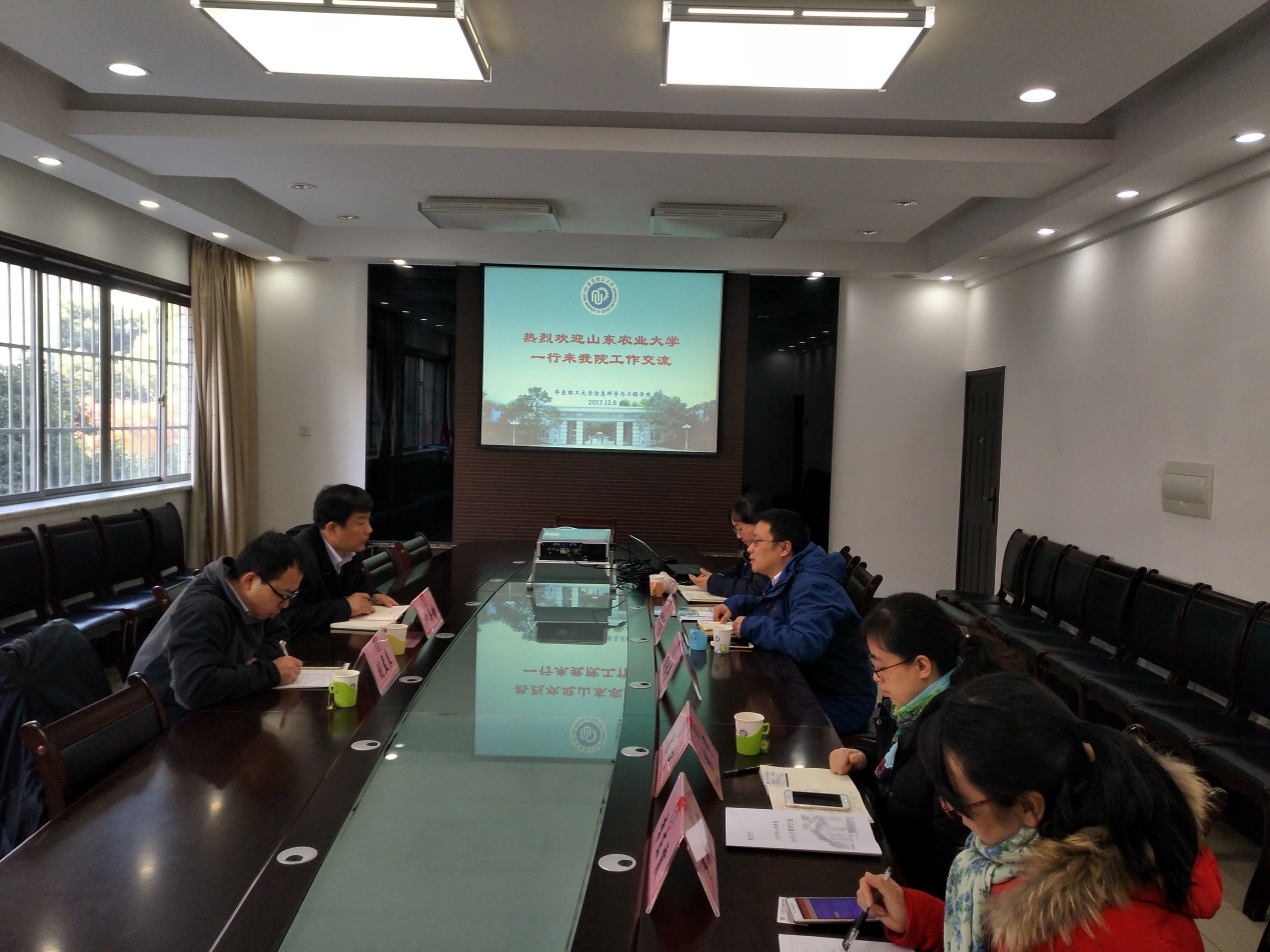 柳平增对山东农业大学信息学院的基本情况进行简要介绍,重点就师资队伍建设、师绩效考核、大学生创新创业、学科竞赛等方面做了交流,并希望与信息学院加强合作,吸引信息学院毕业研究生加入到山东农业大学师资队伍中。
