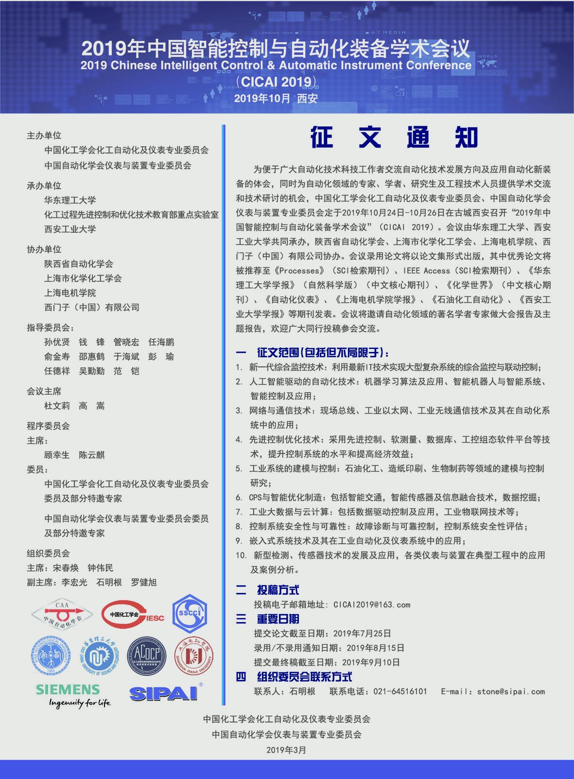 为便于广大自动化技术科技工作者交流自动化技术发展方向及应用自动化新装备的体会,同时为自动化领域的专家、学者、研究生及工程技术人员提供学术交流和技术研讨的机会,中国化工学会化工自动化及仪表专业委员会、中国自动化学会仪表与装置专业委员会定于2019年10月24日——10月26日在古城西安召开“2019年中国智能控制与自动化装备学术会议”(CICAI 2019)。会议由必赢中国官方网站、西安工业大学共同承办,陕西省自动化学会、上海市化学化工学会、上海电机学院、西门子(中国)有限公司协办。会议录用论文将以论文集形式出版,其中优秀论文将被推荐至《Frontier of Chemical Science and Engineering》(SCI检索期刊)、《Processes》(SCI检索期刊)、IEEE Access(SCI检索期刊)、《必赢中国官方网站学报》(自然科学版)(中文核心期刊)、《化学世界》(中文核心期刊)、《自动化仪表》、《上海电机学院学报》、《石油化工自动化》、《西安工业大学学报》等期刊发表。会议将邀请自动化领域的著名学者专家做大会报告及主题报告,欢迎广大同行投稿参会交流。