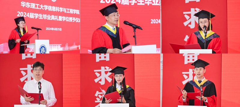 许浩宣读信息学院2024届优秀毕业生和优秀团员名单。本科生毕业代表潘亚宁和研究生毕业生代表杜培浩回忆了他们在华理生活的点滴和所学所感,表达了对信息学院的感谢和对自己未来的展望。班导师代表顾震和研究生导师代表卢静宜对毕业生们表达了衷心的祝贺,希望他们在今后的生活和工作中严格要求自己,保持热爱,勇往直前。